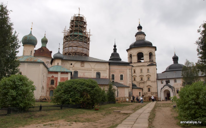 Сейчас в Кирилло-Белозерском монастыре одиннадцать церквей. Но главный собор монастыря - Успенский, который был построен на месте захоронения основателя монастыря Кирилла (сама рака с его мощами находится вроде бы в соседнем храме - в церкви Кирилла), оказался на реставрации, и ломиться в него мы не стали. Вместо этого мы послушали песнопения в церкви Архангела Гавриила, а затем вышли на берег Сиверского озера и полюбовались его берегами.