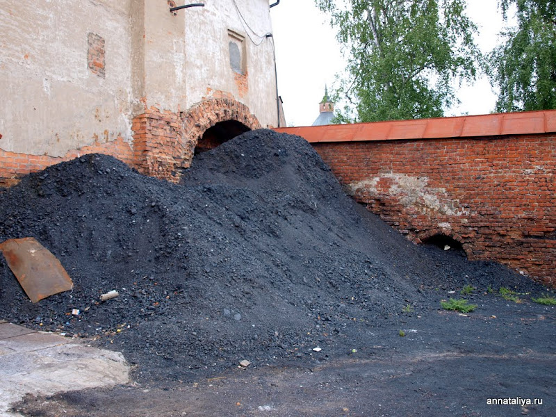 Монахам не разрешалось иметь никаких личных вещей и еды - ели они все вместе в специальной трапезной после служб. Собираться больше, чем по двое, им тоже не разрешалось. В кельях же они только спали и молились. Как сейчас устроены современные кельи, я вам сказать, конечно, не могу. Но, по всей видимости, центральное отопление в них отсутствует. По крайней мере, в одном из внутренних двориков монастыря мы обнаружили огромную кучу угля.