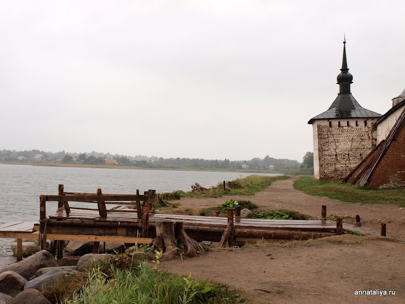 На четвертый день нашего водного путешествия мы вошли в Белое озеро. По нему теплоход шел долго. Озеро огромное, его берегов было почти не видно, лишь узкую темную полоску на горизонте можно было принять за сушу. К обеду мы вышли из Белого и пошли по Шексне, а затем причалили у пристани в деревне Кузино. Эта пристань действует только второй год и, похоже, что скоро станет чем-то вроде Мандрогов. Здесь уже вовсю строятся деревянные дома под русскую старину (кстати, опять-таки с крокодилами в декоре) и лодки-катамараны - очень похожие мы видели в Индонезии на острове Ява. Еще раз поудивлявшись на новый "русский" стиль, мы пошли к автобусу. Из Кузино у нас предполагалась экскурсия в Кирилло-Белозерский монастырь, до которого отсюда было чуть более 15 километров.