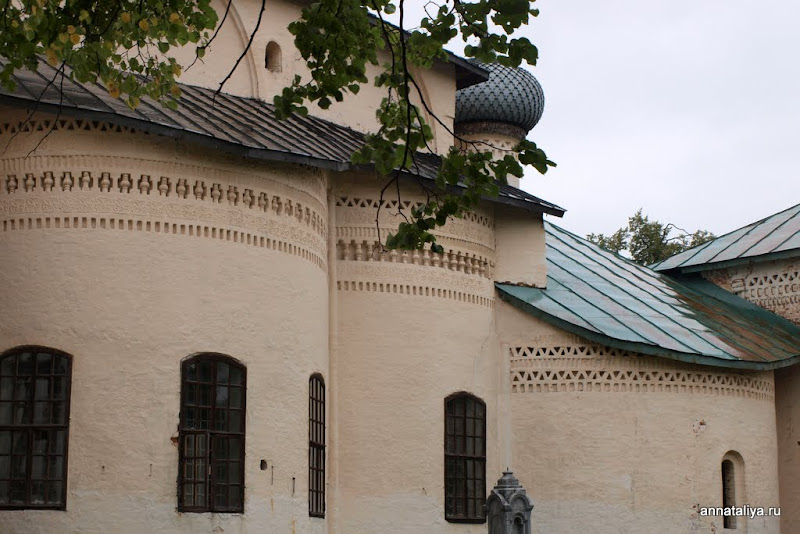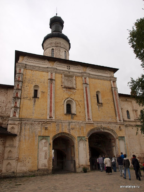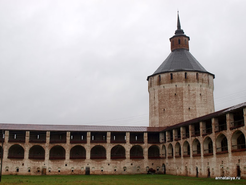Вот, на одном из таких крылечек мы и решили покормить Данилку. Сейчас в кельях, по всей видимости, живут трудники, потому что, завидев нас с коляской, они почему-то приняли нас за своих и, проходя мимо, просили о каких-то мелких услугах: то помочь открыть дверь, то закрыть ее за ними. Кстати, что касается келий и монашеского быта, то во времена Кирилла здесь было очень даже сурово. Я потом заходила в келью, обставленную по тому времени. Это была небольшая комнатка, в которой висела икона, перед ней стояла подставка для библии, у стены лавка для спанья - вот, в принципе, и всё.