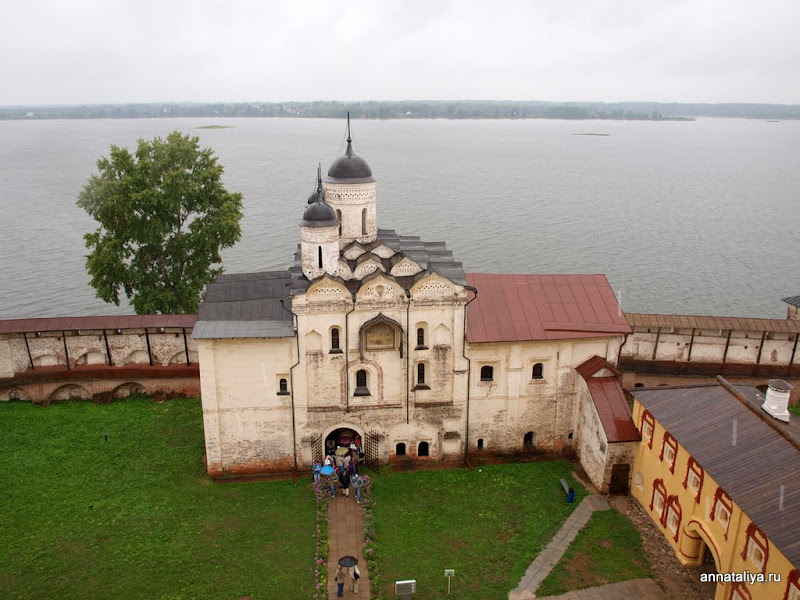 Но Ферапонт вскоре отправился дальше и у Бодаевского озера основал Ферапонтовский монастырь, расположенный сейчас неподалеку от Кирилло-Белозерского монастыря, а Кирилл остался и вскоре рядом с крестом срубил и освятил первую деревянную церковь своей новой обители - во имя Успения Богородицы.